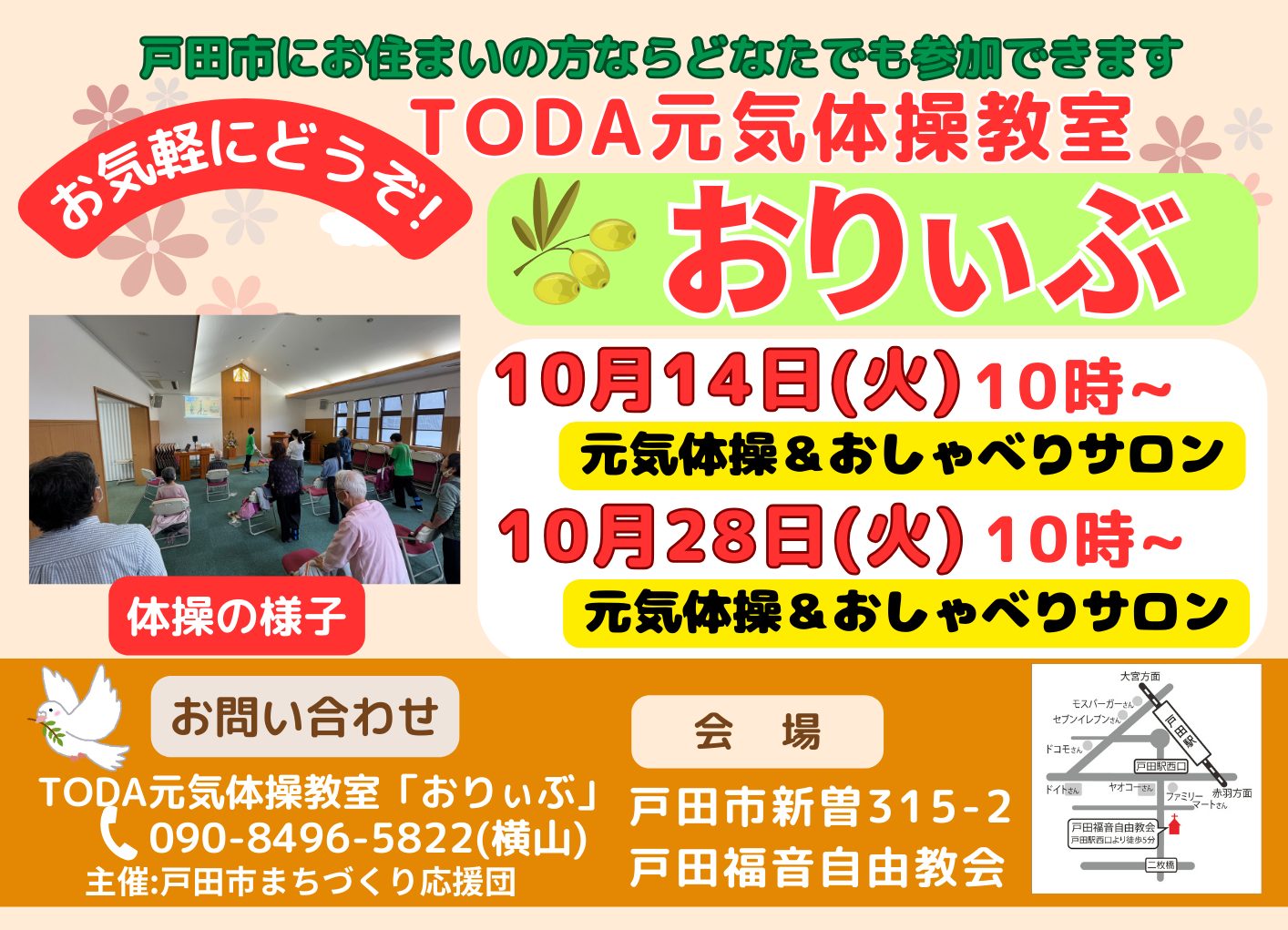 毎月第2、第4火曜日10時から教会を会場に「TODA元気体操」が行われています。いつまでも健康で、現在の生活を維持するためにご参加ください。